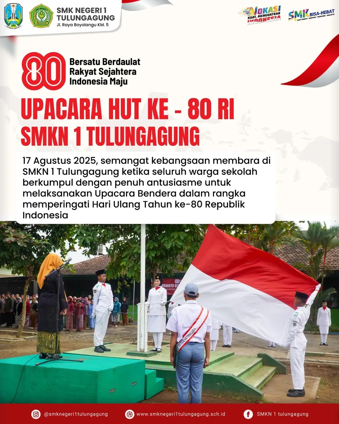 17 Agustus 2025, semangat kebangsaan membara di SMKN 1 Tulungagung ketika seluruh warga sekolah berkumpul dengan penuh antusiasme untuk melaksanakan Upacara Bendera dalam rangka memperingati Hari Ulang Tahun ke-80 Republik Indonesia